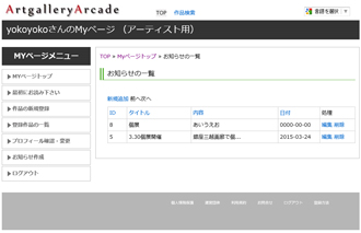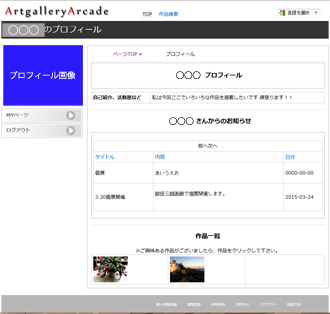 アーティストプロフィール画面に個展などのお知らせを入れることができます。